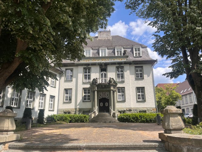 Parkeerplaatsen - tegen betaling - zijn beschikbaar bij het gemeentehuis, Weststraße 46, 59269 Beckum.Trouwzaal in het stadhuisPlein voor het stadhuis - ideaal voor een champagnereceptie na de huwelijksceremonieStadsmuseum