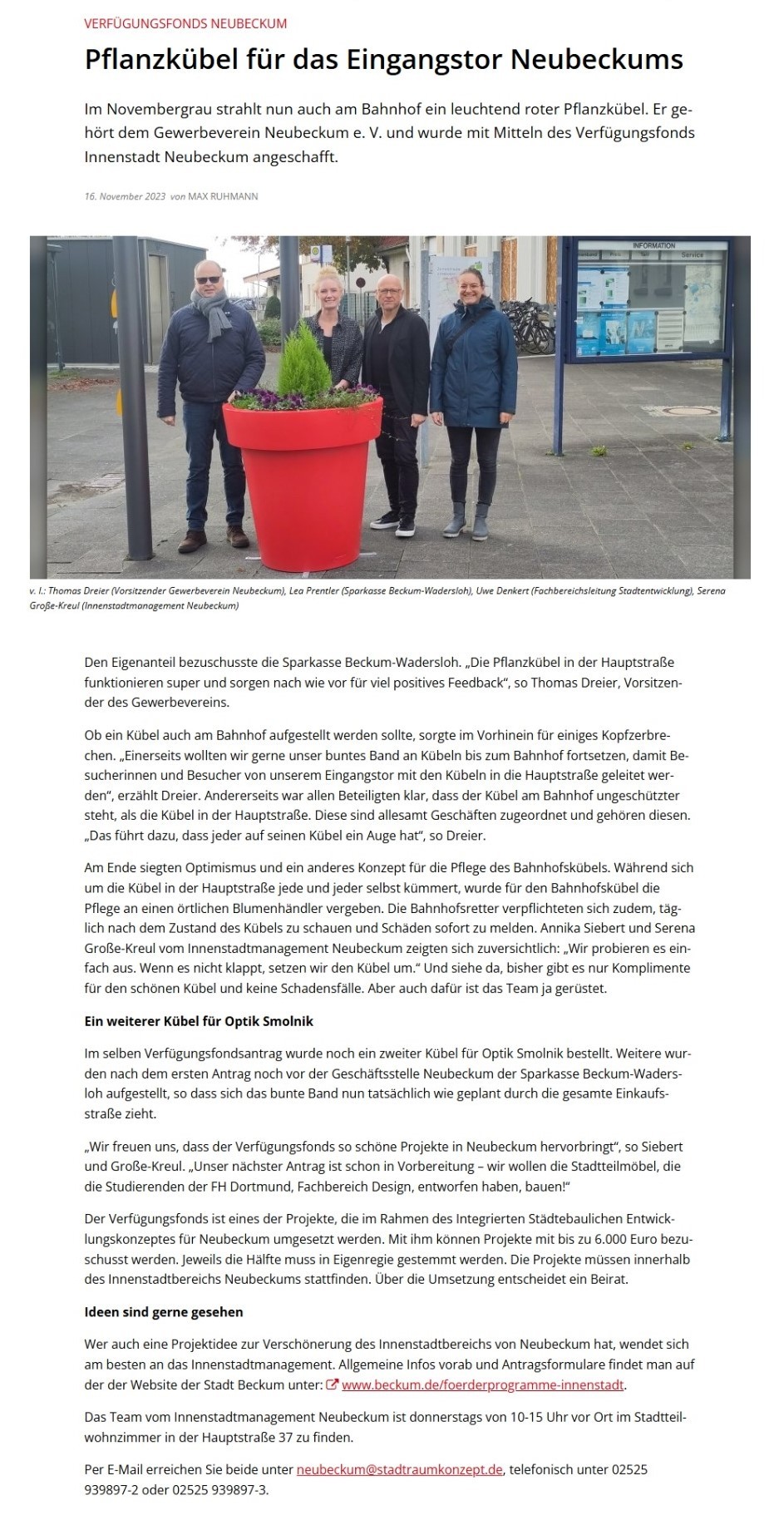 Pressemeldung vom 15.12.2023Pflanzkübel für das Eingangstor Neubeckums