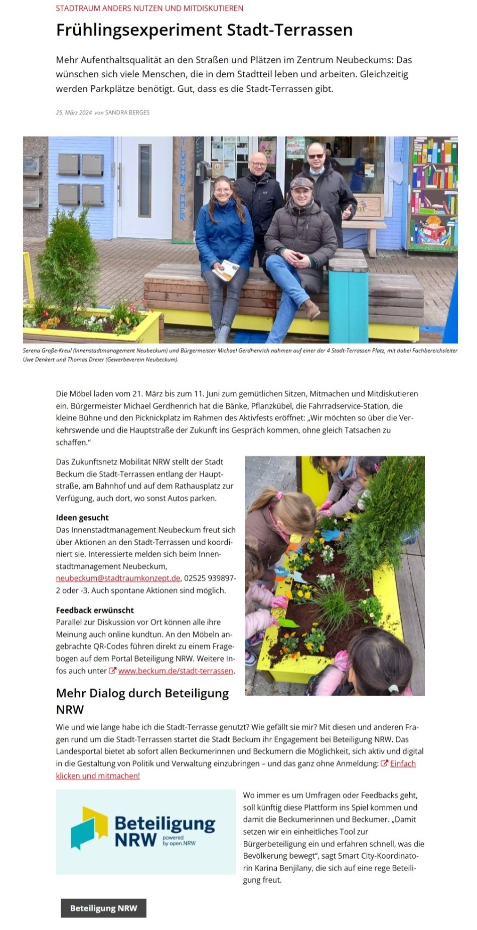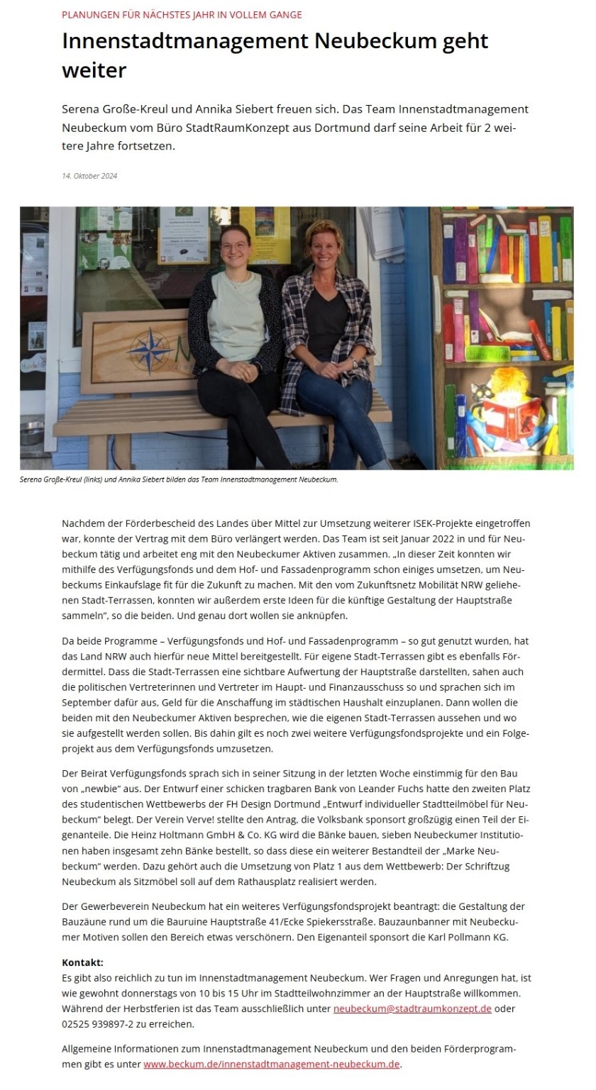 Seit Januar 2022 sind wir vom Büro STADTRAUMKONZEPT aus Dortmund mit dem Innenstadtmanagement in Neubeckum betraut.